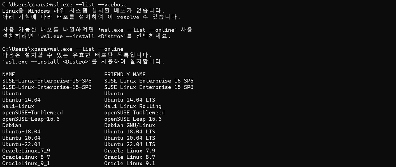 wsl --list --online 또는 wsl -l -o | 설치 가능한 배포판 목록 확인 |