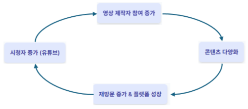 제작자가 늘어나면 콘텐츠가 더욱 다양해지고, 다시 시청자들의 방문이 더 잦아지면서 플랫폼이 더 성장하게 됩니다.