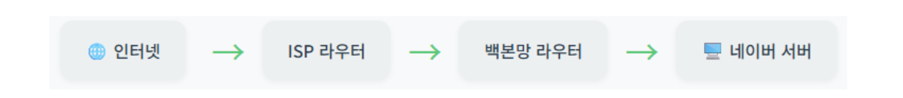 ④ 라우팅: 패킷은 인터넷 서비스 제공업체(ISP)의 여러 라우터를 거치며, 네이버 서버까지 도달할 수 있는 가장 빠르고 효율적인 경로로 전달됩니다.