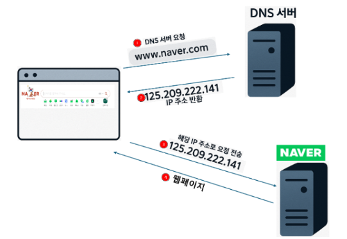 이때 노트북은 먼저 DNS 서버에 “naver.com의 IP 주소가 무엇인가요?”라고 요청을 보냅니다.