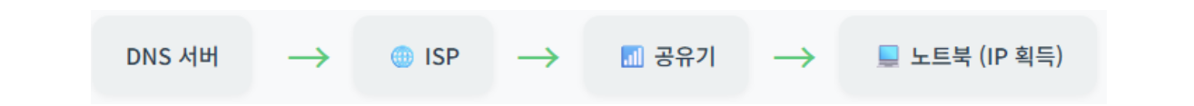 ① DNS 질의: 노트북은 먼저 입력한 도메인 이름을 DNS 서버에 질의하여 IP 주소를 요청합니다. 이 요청은 공유기(라우터)를 통해 게이트웨이를 지나 ISP 네트워크로 전송되며, DNS 서버에 도달하게 됩니다.