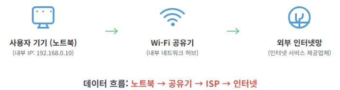 ‘노트북 → 공유기 → ISP → 인터넷’ 순으로 흐르게 됩니다.