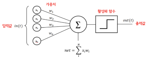🔸4. 활성화 함수 적용(Activation Function) : 계산된 합 z에 활성화 함수(activation function)를 적용하여 최종 출력값을 결정합니다. 예를 들어, 결과값이 0.5를 넘으면 '합격', 그렇지 않으면 '불합격'으로 판단하는 식입니다.
