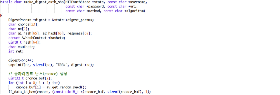 위와 같이 소스를 수정하면 FFmpeg는 서버로부터 WWW-Authenticate: Digest algorithm="SHA-256" 응답을 수신했을 때도 SHA-256 해시를 계산해 인증 응답을 생성할 수 있게 됩니다.