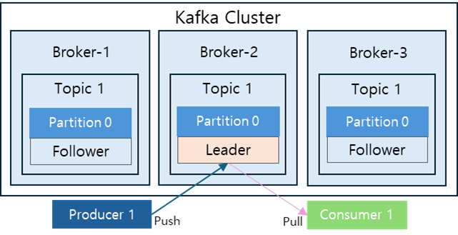 - 복제본 수 (Replication Factor): 3 (리더 1개 + 팔로워 2개)