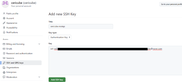 ▸ 모두 입력했다면 Add SSH key 또는 Save 버튼을 눌러 등록을 완료합니다.