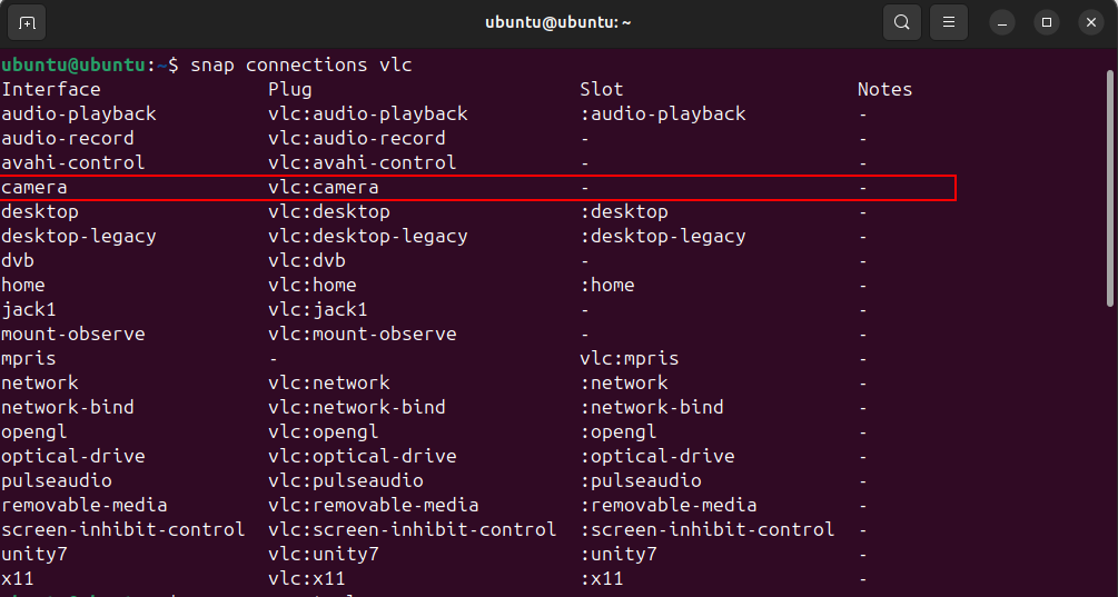 이 명령어는 Snap VLC가 시스템의 카메라 장치에 접근할 수 있도록 권한을 연결합니다.