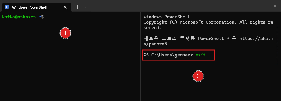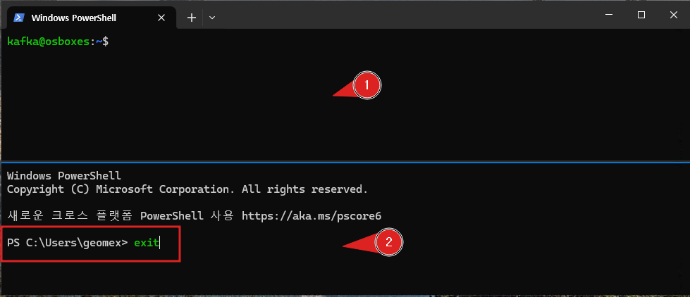 - 분할 된 창에서 “exit”명령으로 분할 창을 제거합니다。