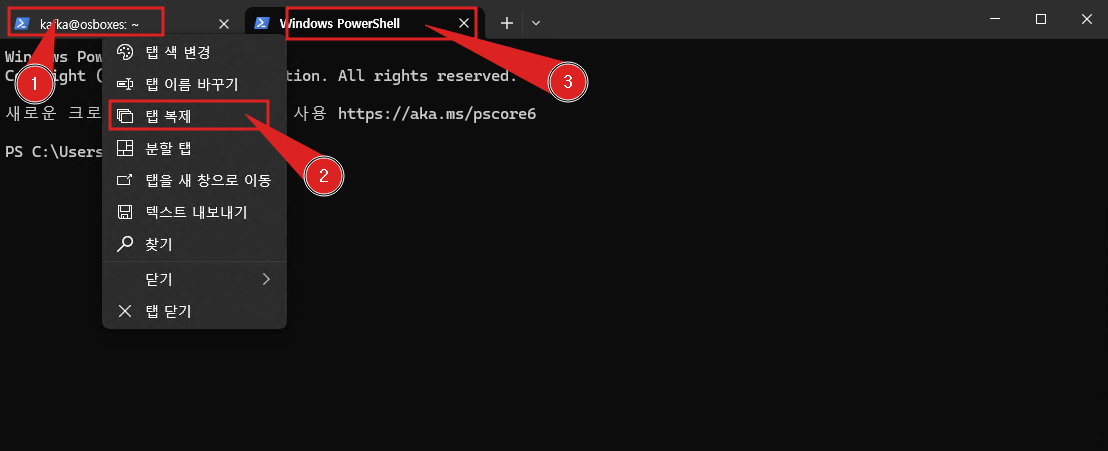 - Windows Terminal Tab에서 마우스 우측 버튼을 클릭하여 탭을 복제합니다.