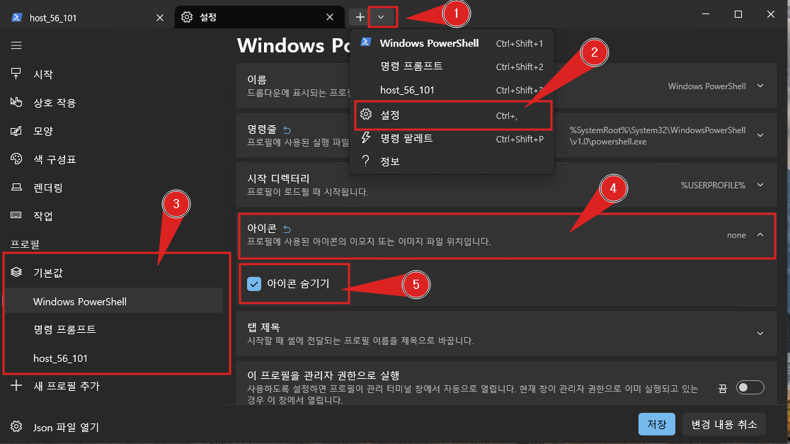- 설정에서 새로운 프로필을 추가하고 이름, 명령, 아이콘 등을 지정합니다.