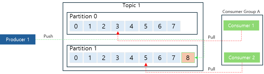 - Producer가 Partition 1으로 메시지를 Push하면 해당 Partition 1의 맨 뒤에 메시지가 추가되며, Offset이 증가(8)합니다.