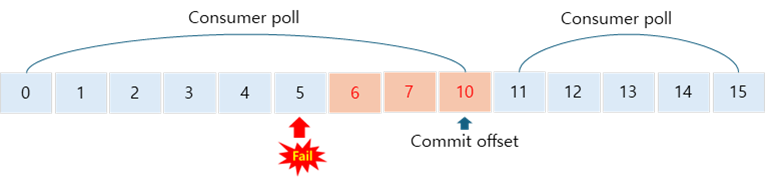 - 하지만 Consumer는 Offset 5까지만 처리한 후, 자동 Commit 간격이 지나기 전에 장애로 인해 중단되었습니다.