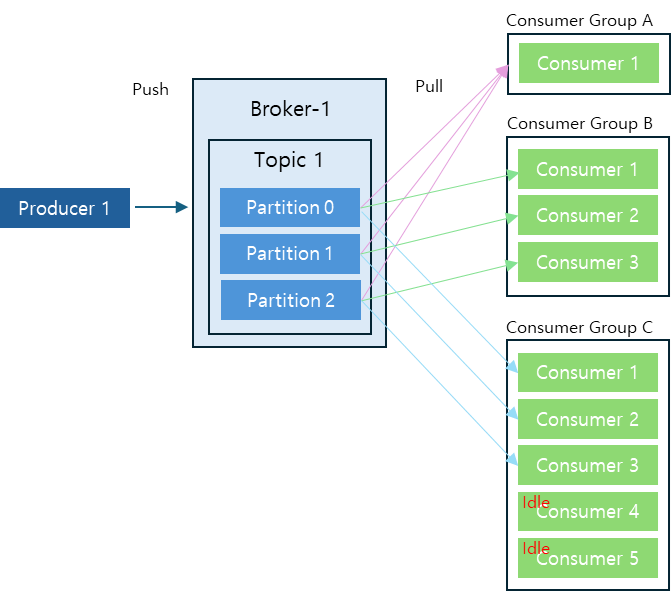 - 아래 그림에서 Consumer Group group-A은 consumer-1과 consumer-2를 포함합니다.