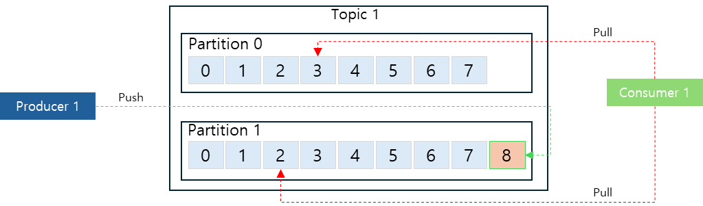 - Producer가 Partition 1으로 메시지를 Push하면 해당 Partition 1의 맨 뒤에 메시지가 추가되며, Offset이 증가(8)합니다.