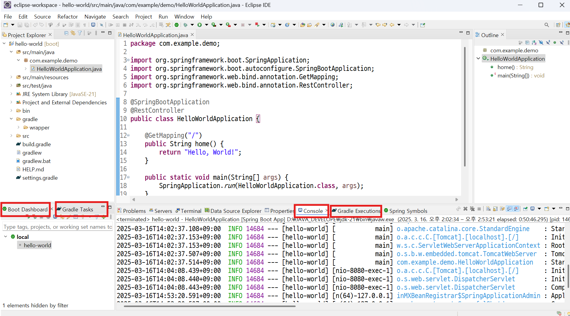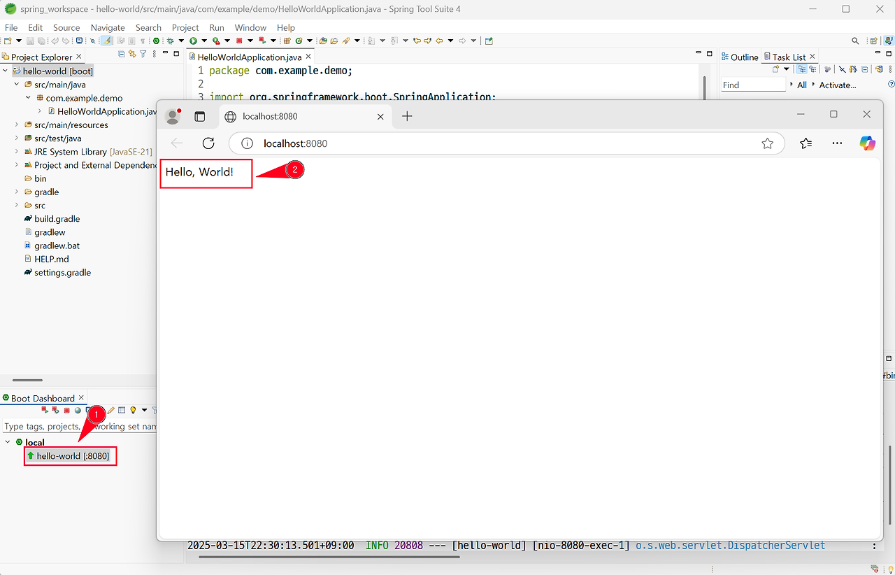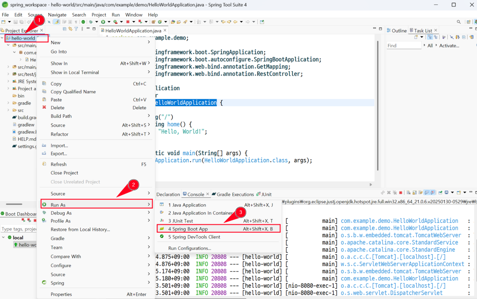 2. src/main/java/com/example/demo/HelloWorldApplication.java 파일을 아래와 같이 작성합니다.