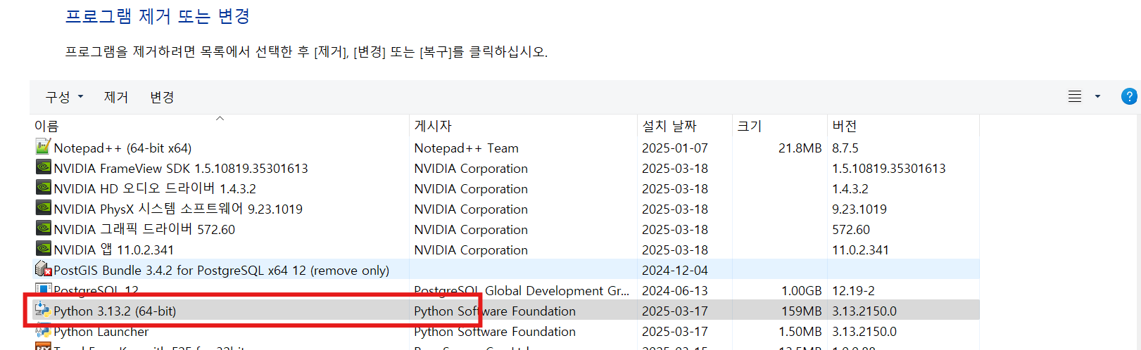 설치한 Python은 제어판 → 프로그램 제거에서 삭제합니다.