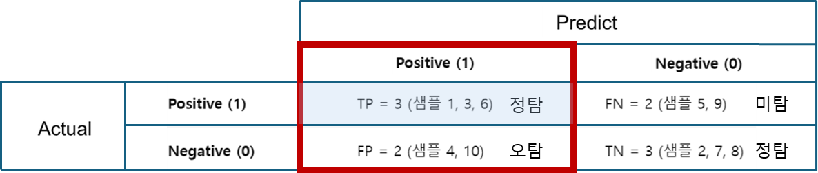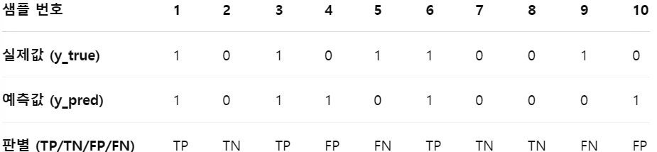 | FP (False Positive) | 실제는 0(음성) 인데 1(양성) 으로 예측 → 오탐 | 4, 10 |