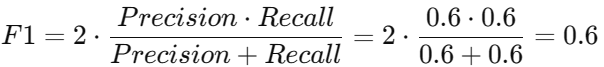 ◆ 해석: Precision과 Recall이 같기 때문에 F1도 0.6입니다.