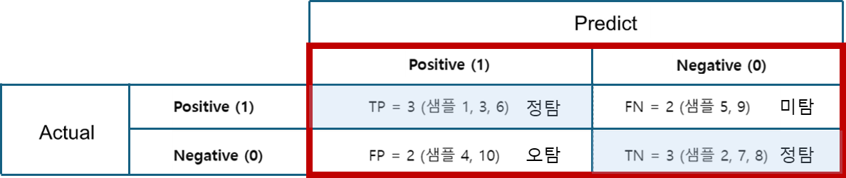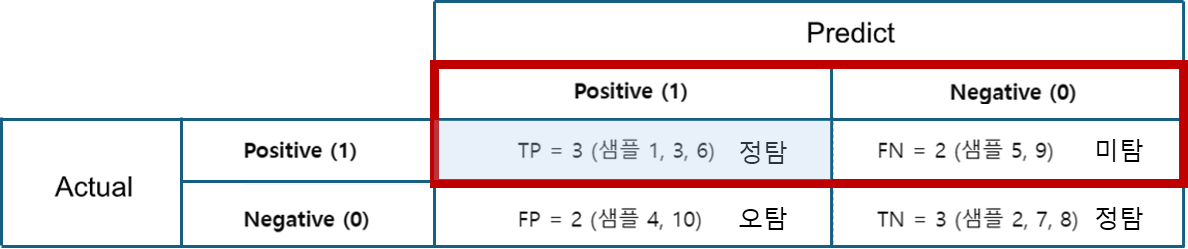 | FN (False Negative) | 실제는 1(양성) 인데 0(음성) 으로 예측 → 미탐 | 5, 9 |