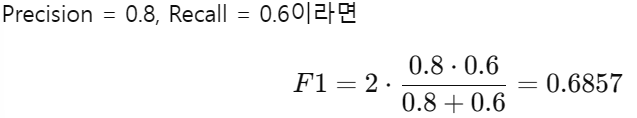 - Precision과 Recall 중 하나가 낮으면 F1도 낮아짐