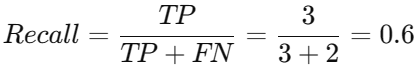 - Recall = 8 / 10 = 0.8 (80%)