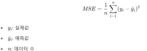 MSE는 오차의 크기를 제곱해서 평균낸 값으로, 큰 오차가 발생하면 그 영향력이 크게 반영됩니다.