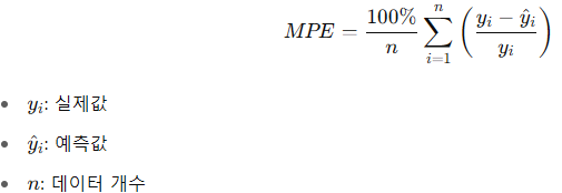 MPE는 예측값이 실제값보다 평균적으로 얼마나 높은지(과대 예측), 낮은지(과소 예측)를 백분율로 계산해 보여주는 지표입니다.
