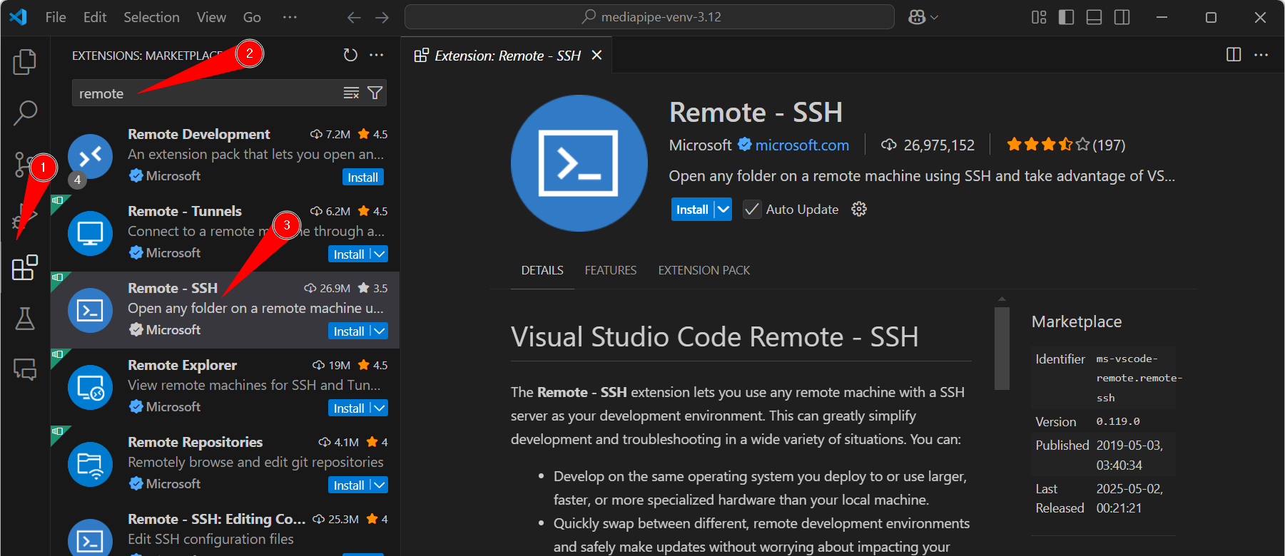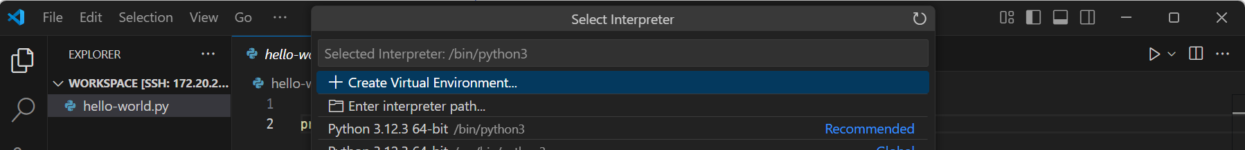 Ctrl + Shift + P → Python: Select Interpreter → Create Virtual Environment → Venv → Enter interpreter path → Find 를 선택 후 원격 가상 환경을 설정합니다.