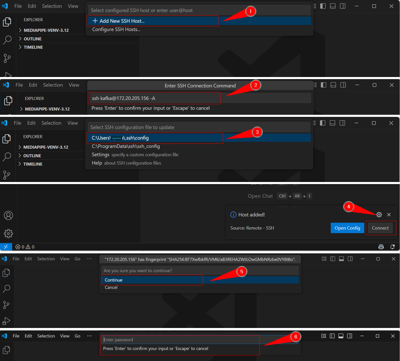 2. 아래 그림을 참조해서 SSH 접속 설정을 한다.(설정 중 VSCode 새창이 활성화 됩니다.)