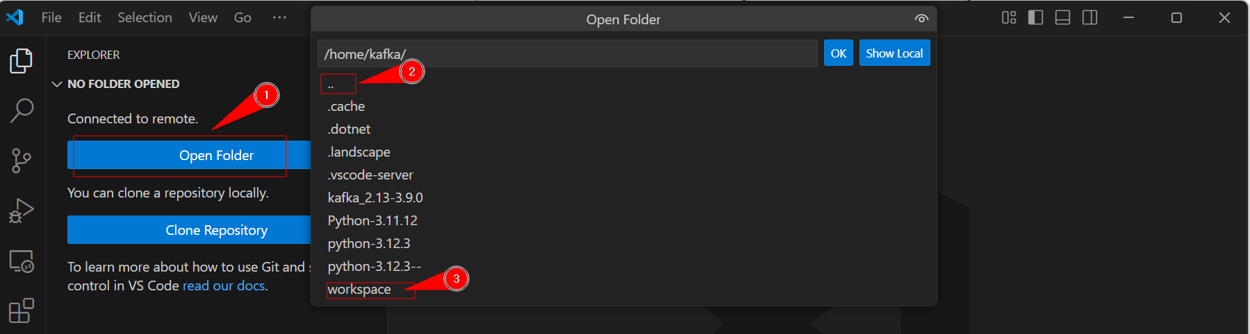 연결 후 File > Open Folder 메뉴를 클릭하고 원격 서버의 작업 디렉토리를 선택합니다.
