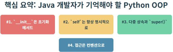 11편. Python 프로그래밍 사고 전환 – Java 스타일에서 Python 스타일로 📚 목차1. 리스트 컴프리헨션 (List Comprehension) - for문을 한 줄로 줄이기2. Unpacking과 Zip - 여러 값을 더 직관적으로 다루기3. Context Manager (with 문) - 자원 관리를 자동으로 처리하기4. 코드 스타일 가이드 (PEP8) - Python답게 쓰는 문법 습관✔ 마무리 - Pythonic 사고의 시작점 “Java로는 이렇게 안 했는데…”Python을 처음 접한 Java 개발자라면 한 번쯤 이렇게 생각해본 적 있을 것입니다.Java는 정형화된 구조와 강한 타입 안정성을 중시하는 언어입니다. 반면, Python은 간결성과 유연함을 바탕으로 '무엇을 할지'에 더 집..