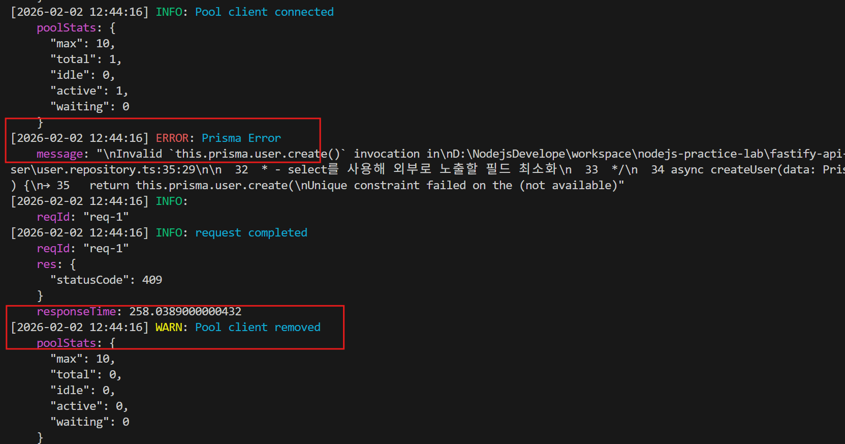 10편. Prisma 쿼리 실패 후 Pool에서 Connection이 제거되는 이유 📚 목차1. 문제 맥락: 왜 CREATE 실패 시 Connection 이 바로 제거될까?2. pg Pool 내부: _release() 로 보는 Connection 생명주기3. Prisma 7 + PostgreSQL Adapter에서 Pool 사용 구조4. Prisma · Pool · pg-adapter 로깅 코드 예시 1. 문제 맥락: 왜 CREATE 실패 시 Connection 이 바로 제거될까?실제 서비스를 구현하고 테스트하는 과정에서 다음과 같은 패턴을 관찰할 수 있습니다. 일반적으로 connection pool을 사용하는 경우, 쿼리 실행이 완료되면 사용하던 connection은 pool로 반환되어 재사용된다고 ..